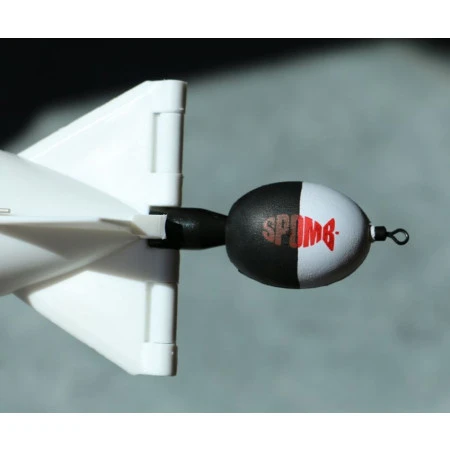 In deze drijvers zit een kanaaltje waardoor je de drijver eenvoudig over de achterzijde van de Spomb schuift.