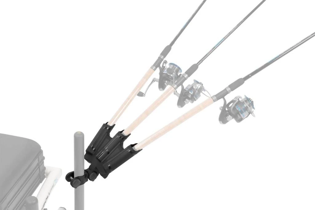 De triple rod support van preston innovations zorgt er voor dat u altijd tot drie hengels binnen handbereik van uw zitkist heeft.