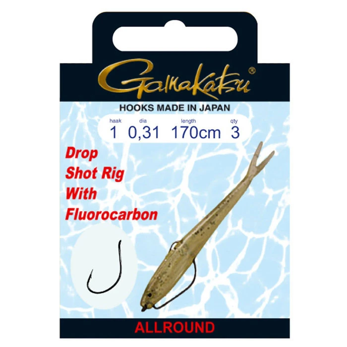De haak zit op 60 cm vanaf de bovenkant van de fluorocarbon onderlijn die in totaal 170 cm lang is. Voorzien van een worm 39 gamakatsu haak die perfect is voor het dropshotten.